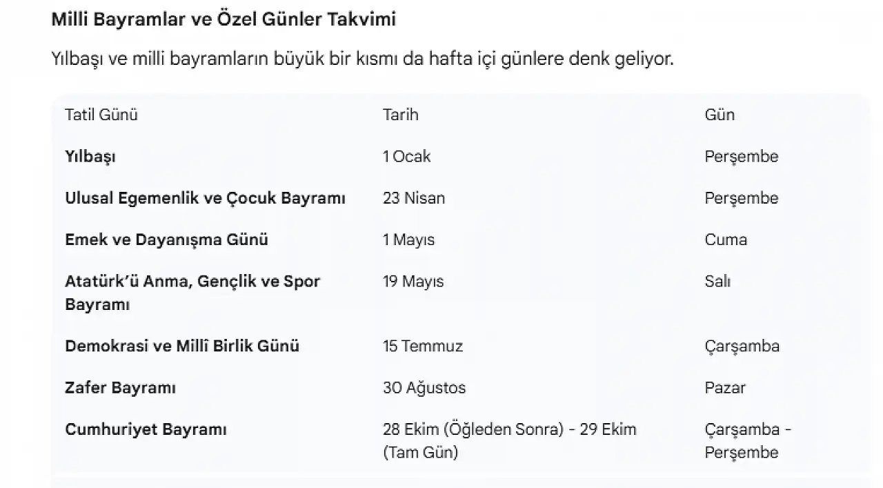 Yeni yılda izinlerinizi planlarken kullanabileceğiniz tam liste şu şekilde: