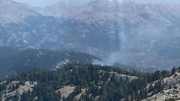 Ekiplerin sarp arazideki yangını kontrol altına alma çalışması sürüyor.