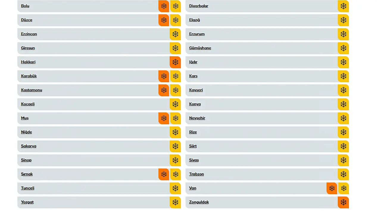 Özellikle karın hayatı durma noktasına getirebileceği Bingöl, Bitlis, Bolu, Hakkari, Kastamonu, Muş, Van, Zonguldak, Şırnak, Karabük, Bartın ve Düzce için "turuncu" kodlu uyarı yapıldı. Bu illerde yağışın yer yer yoğunlaşarak ulaşımı etkilemesi bekleniyor.