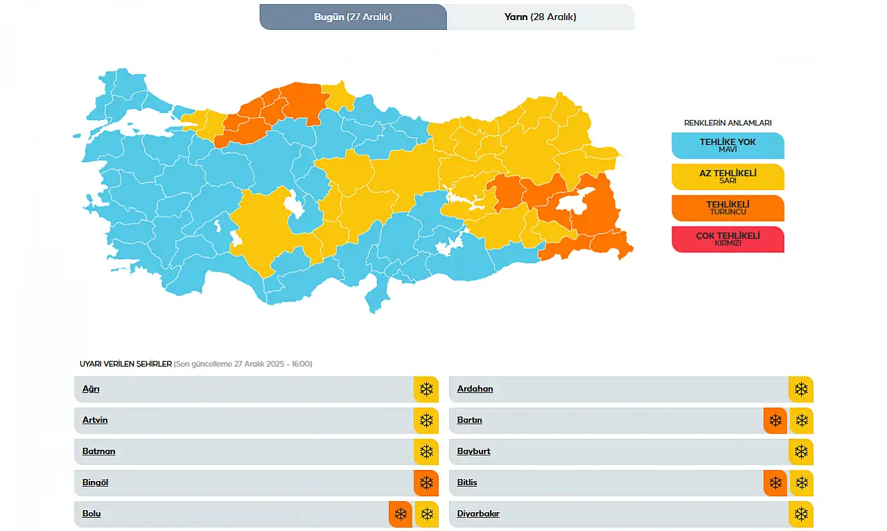 Yurt genelinde kış yüzünü sert bir şekilde göstermeye başladı. Meteoroloji Genel Müdürlüğü’nün son verilerine göre; Marmara’dan Doğu Anadolu’ya kadar geniş bir coğrafyada yoğun kar yağışı ve dondurucu soğuklar etkili olacak. 12 ilde "turuncu", 26 ilde ise "sarı" kodla alarm verilirken vatandaşların ulaşımda aksama ve don olaylarına karşı tedbirli olması istendi.