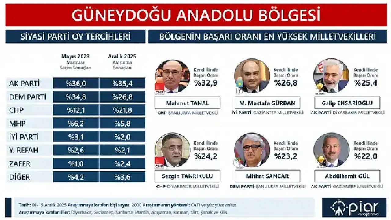 Güneydoğu Anadolu Bölgesi'nde ise AK Parti %35,4 ile ilk sırada yer alırken, onu %26,8 ile DEM Parti ve %21,8 ile CHP takip ediyor. CHP'nin bölgedeki yükselişi dikkat çeken unsurlar arasında yer alıyor.