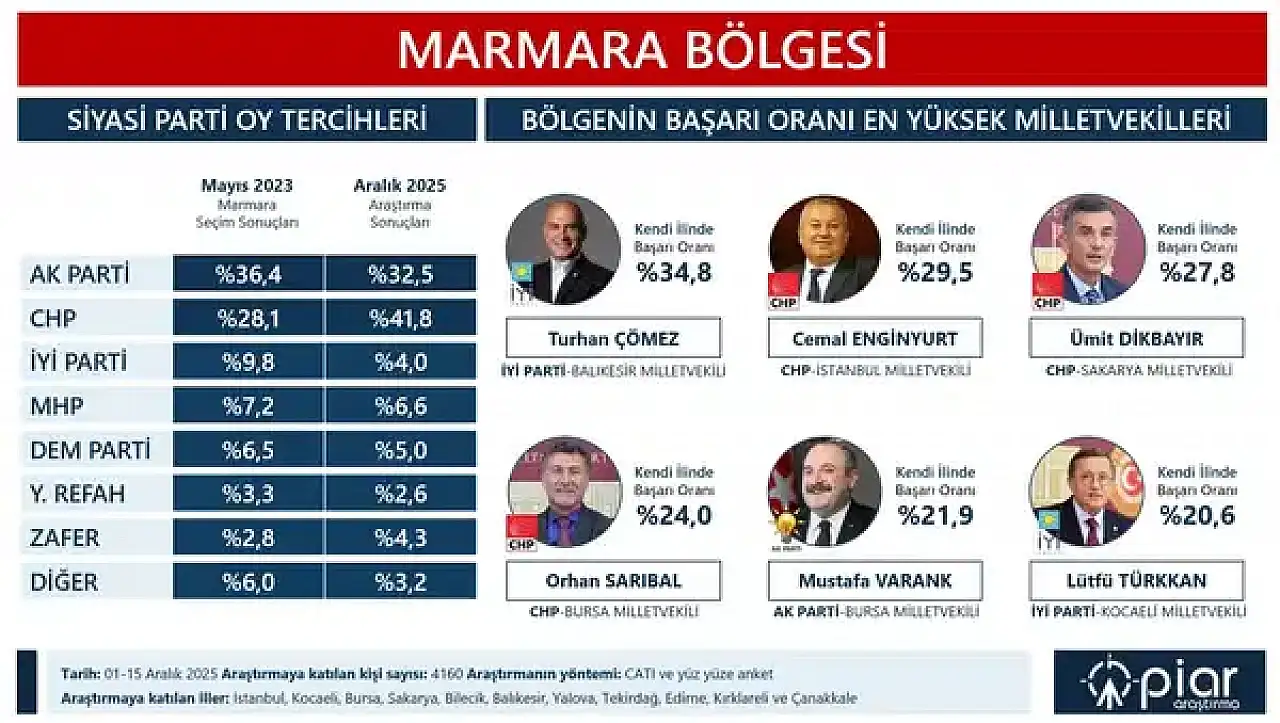 PİAR Araştırma, 2025 yılının finalini yedi bölgede gerçekleştirdiği kapsamlı bir kamuoyu araştırmasıyla yaptı. Sonuçları paylaşılan dört bölge, seçmen eğilimlerinde radikal değişimler yaşandığını gözler önüne serdi. Özellikle Ege Bölgesi'ndeki tablo, siyaset kulislerini hareketlendirecek cinsten.