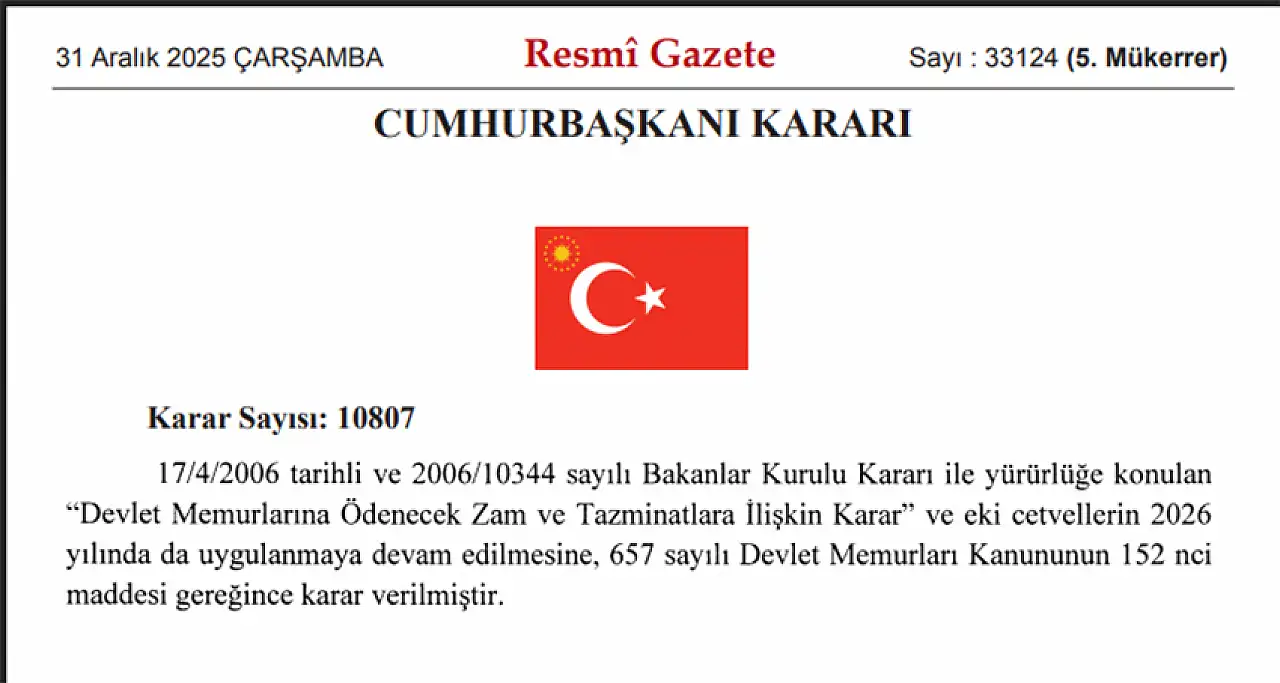 Yeni yılın son dakikalarında yayımlanan Resmi Gazete, kamu personeli için kritik bir belirsizliği ortadan kaldırdı. Memur maaş pusulasının en yüksek kalemlerini oluşturan tazminatların dayanağı olan 2006/10344 sayılı Bakanlar Kurulu Kararı, 2026 yılında da geçerli olacak.