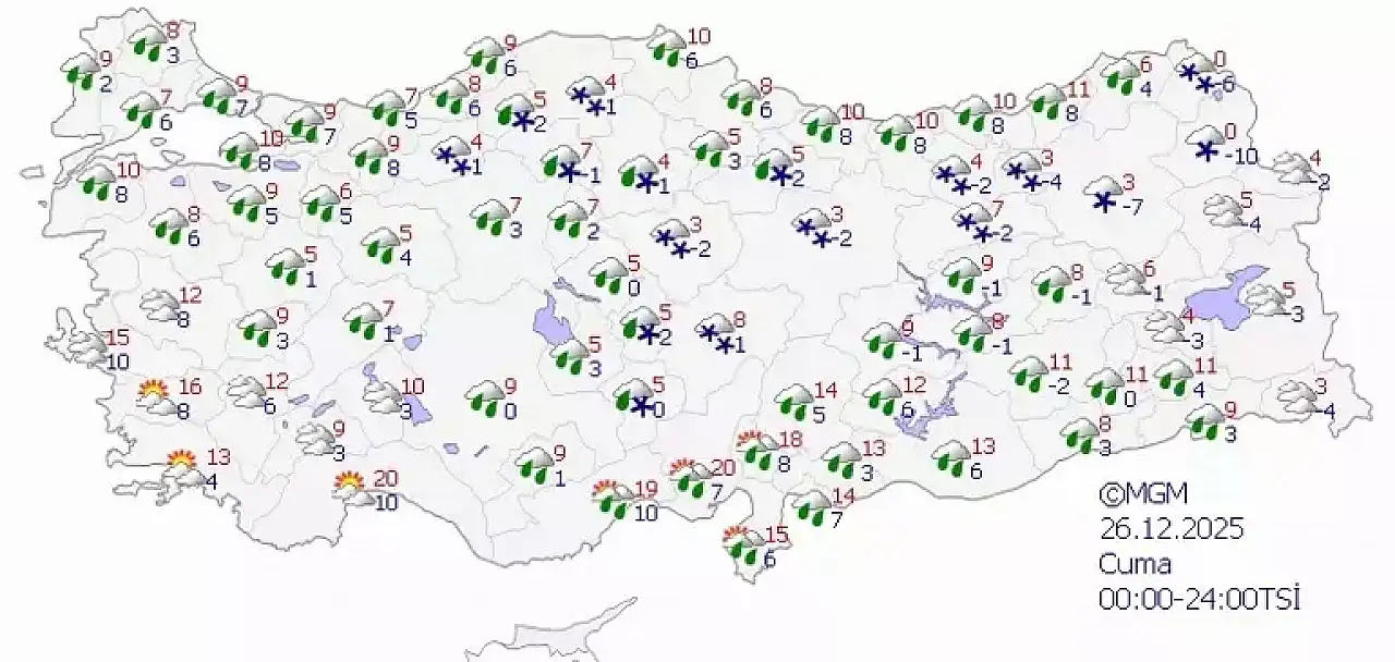 Meteoroloji Genel Müdürlüğü (MGM), 26 Aralık Cuma gününden itibaren Marmara ve İç Anadolu başta olmak üzere birçok bölgenin soğuk ve yağışlı havanın etkisine gireceğini duyurdu. Artvin ve Ardahan çevresinde kar yağışı beklenirken, Ankara Valiliği’nden gelen "zirai don ve buzlanma" uyarısı kar tatili beklentilerini artırdı. Peki, yarın okullar tatil mi? İşte il il son durum...